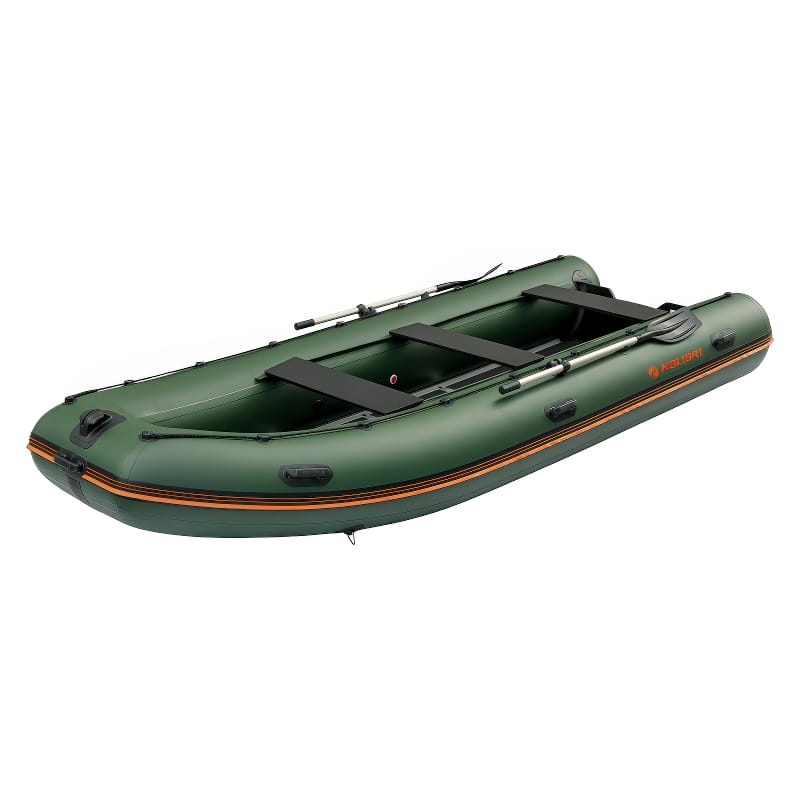 Ši motorinė valtis turi integruotą pripučiamą kilį ir pilną standaus dugno komplektą, pagamintą iš drėgmei atsparios jūrinės faneros. Tokia konstrukcija leidžia valčiai greičiau pasiekti glisavimo režimą ir užtikrina tikslų manevringumą posūkiuose, net kai borto apkrova yra maksimali. Jūs galėsite taupyti degalus ir mėgautis komfortišku plaukimu per bangas be papildomos vibracijos.